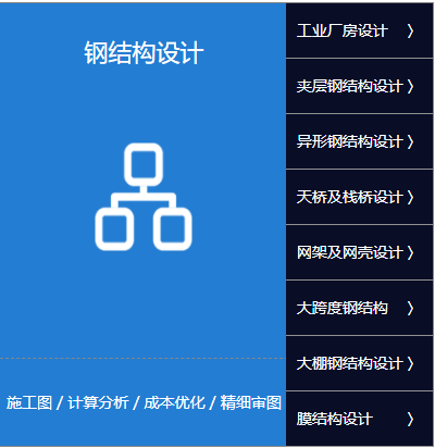 工業廠房設計、夾層鋼結構設計、異型鋼結構設計、天橋及棧橋設計、網架及網殼設計、大跨度鋼結構、大棚鋼結構設計、膜結構設計